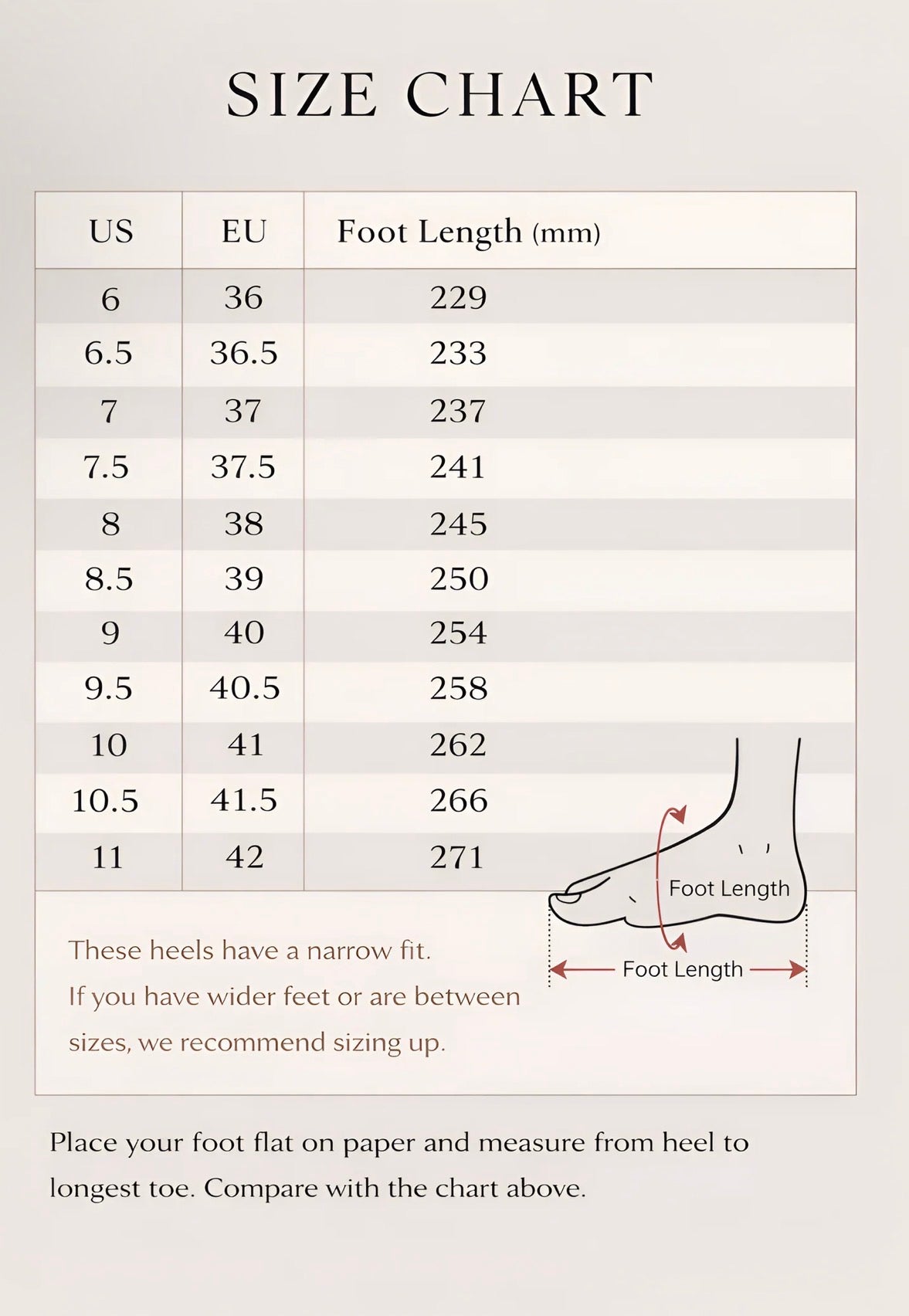 If you’re a true half-size, we always recommend sizing up. It’s better to have a tiny bit of room behind your heel than to have your foot hanging off the edge of a luxury mule.
